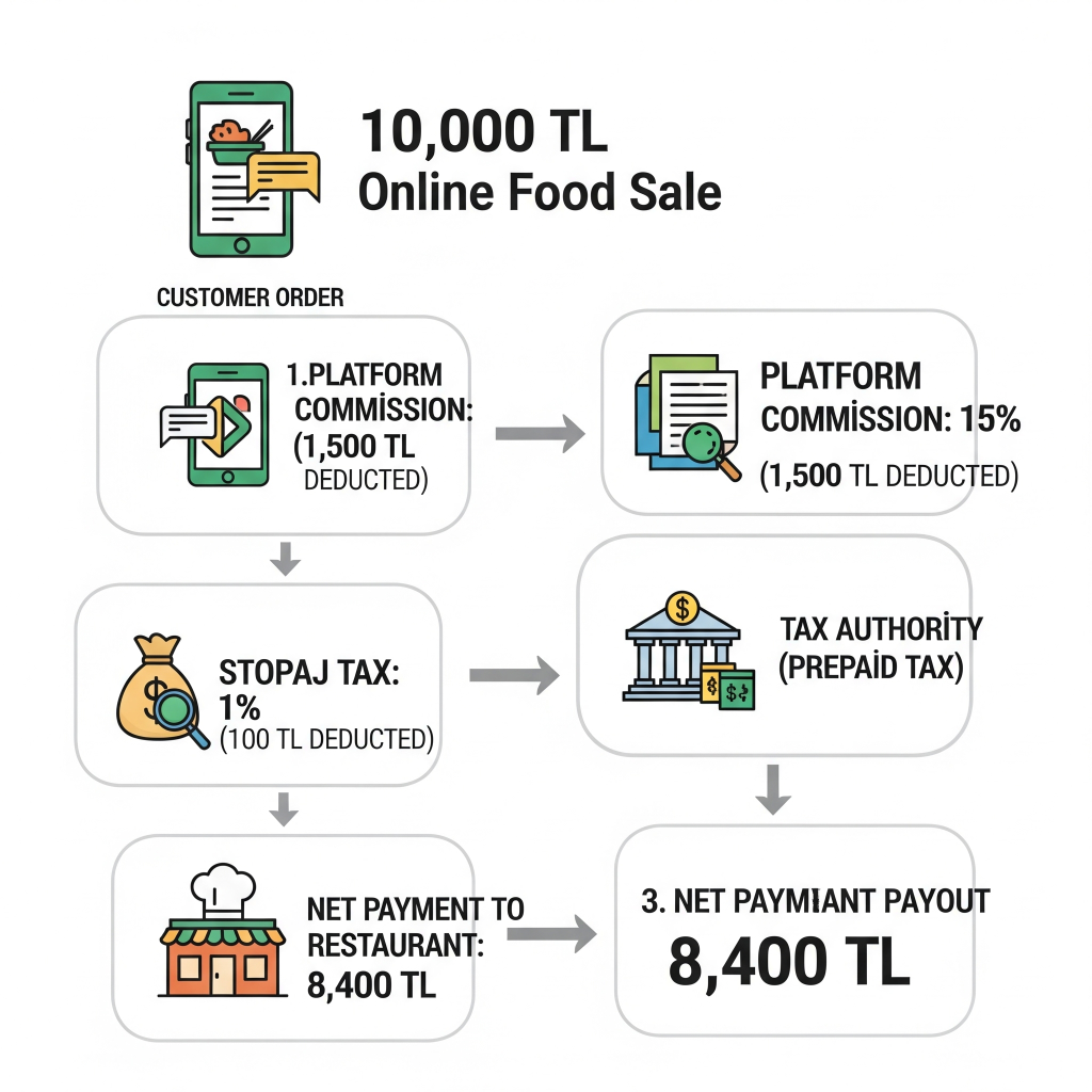 Sonuç: Platform, restorana 8.400 TL öderken, kesilen 100 TL’lik stopajı doğrudan ilgili vergi dairesine yatıracaktır. Restoran, bu 100 TL’yi daha sonra ödeyeceği Gelir veya Kurumlar Vergisinden mahsup edecektir (yani bir nevi peşin ödenmiş vergi olarak düşecektir).
